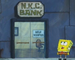 The N.K.C Bank is a bank that is in New Kelp City. It only appears in the episode, What Ever Happened to SpongeBob?. There is a sign on the glass door that says Help Wanted. The Help Wanted Lady in the Bank is also afraid of Bubbles. She asked CheeseHead BrownPants questions. He then got out a bottle of Bubbles an blew a bubble that made the Lady angry and She then threw Him out. It is unknown if the N.K.C Bank will ever re-appear.